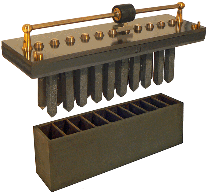 A l'intérieur du coffret est disposée une cuve en gutta-percha comportant dix compartiments. Chaque compartiment reçoit une solution aqueuse d'hydrogénosulfate de mercure (On parlait, autrefois, de sulfate de bioxyde de mercure puis de bisulfate de mercure) dans laquelle vont plonger une électrode en carbone et une électrode en zinc. Deux gros boutons visibles de chaque côté du coffret permettent d'amener la cuve en position haute afin d'immerger l'ensemble des électrodes dans l'électrolyte. Ainsi, chaque compartiment équipé forme un élément de pile dont le pôle positif est le carbone et le pôle négatif, le zinc. Les dix éléments sont électriquement reliés en série. Chacun d'eux possédant une force électromotrice de l'ordre de 1,5 volt, le déplacement du curseur du rhéostat linéaire permet de régler la tension délivrée de 0 à environ 15 volts par bond de 1,5 volt. |