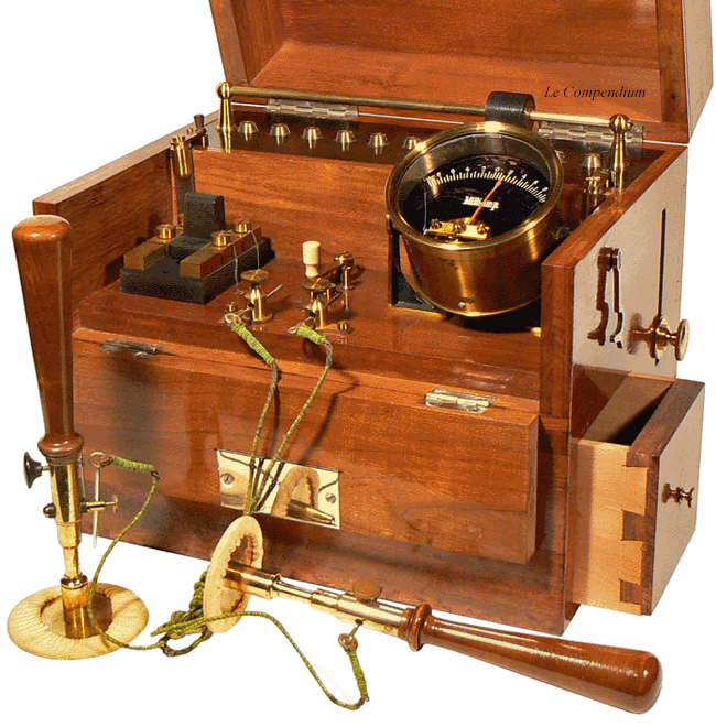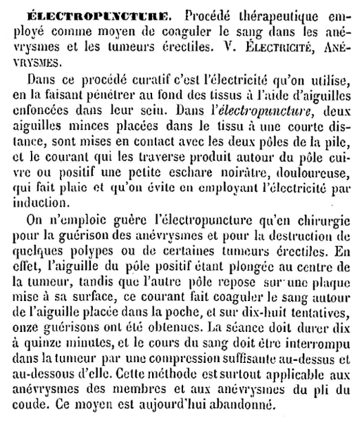 Le tiroir de l'appareil renferme deux excitateurs plats de forme circulaire destinés à être appliqués sur une surface d'une certaine étendue, par exemple un muscle. Pour parfaire le contact, ils sont recouverts d'une peau qui doit être humidifiée. Dans le DICTIONNAIRE DE MÉDECINE ET DE THÉRAPEUTIQUE MÉDICALE ET CHIRURGICALE, les auteurs, E. Bouchut et A. Després évoquent, en 1877, l'utilisation du second ensemble, également présent, constitué par deux manches cylindriques pouvant recevoir des fines aiguilles métalliques, et une plaquette également métallique munie d'un manche isolant. Ci-dessous, nous avons photographiés une partie des éléments tels qu'ils pouvaient être utilisés, et nous avons accompagné l'image de l'article du dictionnaire de 1877 définissant l'électropuncture : |