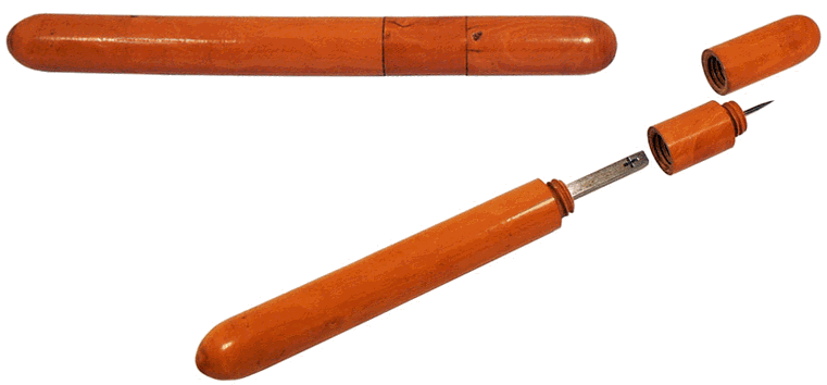 Un petit aimant bien pratique pour récupérer les épingles et aiguilles tombées par terre. Sur la photographie ci-dessus, il est protégé par son armure en fer doux