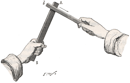 L'aimantation du petit barreau en acier précédent a peut-être été obtenue en le frottant un certain nombre de fois sur le pôle A d'un aimant naturel ou artificiel : en réalisant l'opération dans le sens indiqué par la flèche, il s'est formé en b un pôle de nom contraire à A, et à l'extrémité opposée, un pôle de même