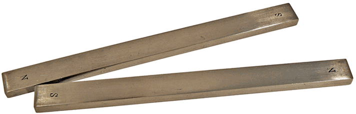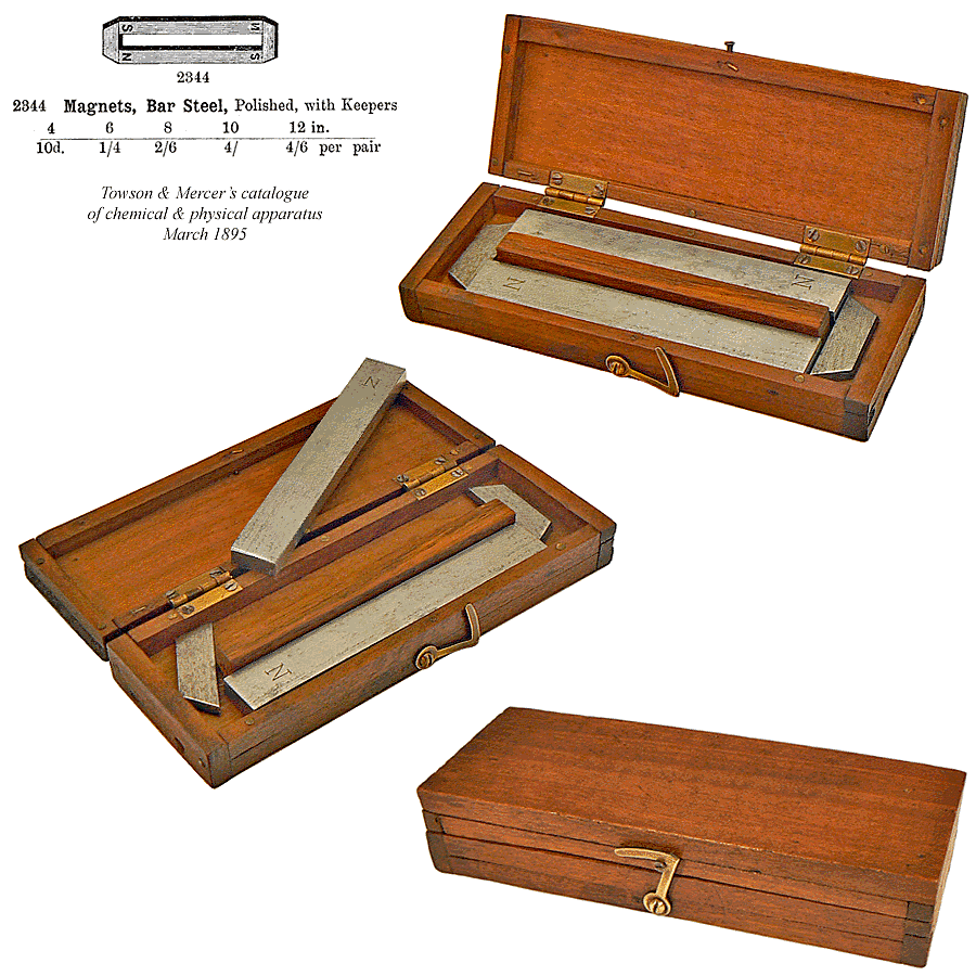 Les barreaux aimantés de 20 cm de longueur, dans leur coffret de rangement, préservés par les armures ou contacts en fer doux.