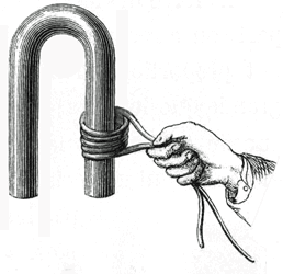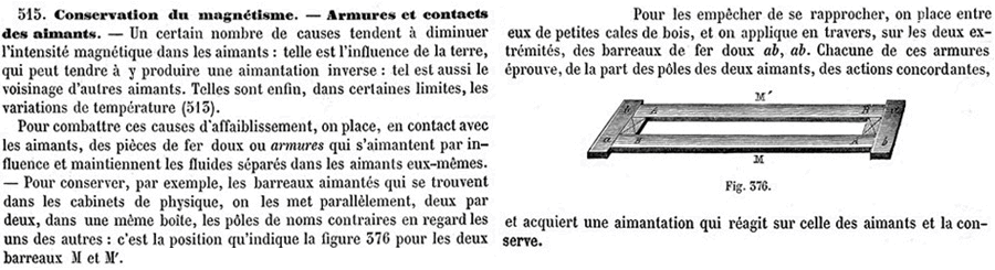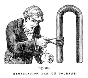 A gauche, le personnage déplace une bobine supposée parcourue par un courant, le long d'une branche de la pièce en acier qu'il veut aimanter. Si la méthode est la bonne, la représentation est étrange car les extrémités de la bobine apparaissent n'être pas reliées à un générateur ! La même remarque peut être faite pour le dessin du Traité élémentaire de physique de A. PRIVAT-DESCHANEL,