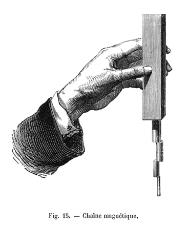 De la même façon, chaque petite pointe de fer doux devient un aimant et reste aimant tant que dure l'influence, c'est à dire tant que la pointe du haut demeure en contact avec le