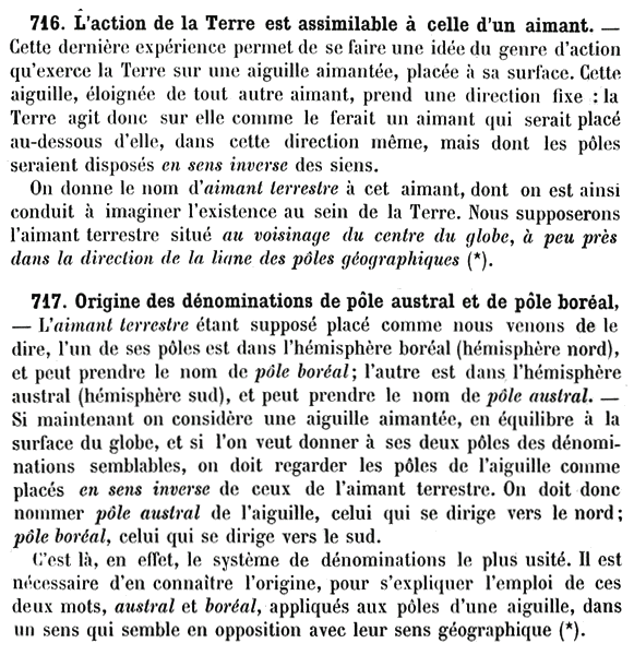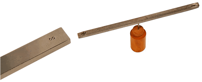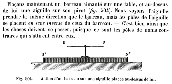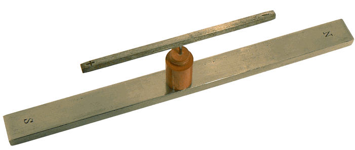 Le barreau aimanté de 10 cm de longueur étant placé sur son pivot, il s'oriente suivant le méridien magnétique du lieu ou il se trouve. L'extrémité repérée par le signe (+) indique le Nord magnétique terrestre. Cette extrémité, appelée pôle nord ou pôle austral du barreau, est souvent repérée par la lettre N. De même, l'extrémité (-) qui est son pôle sud ou pôle boréal, peut l'être par la