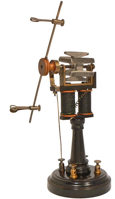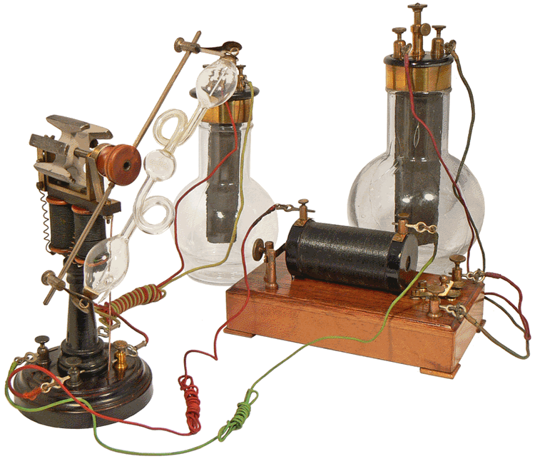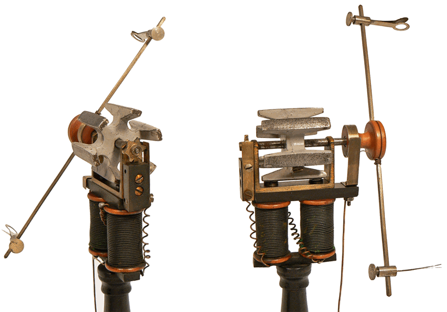 Sur le socle, les deux bornes dorées sont prévues pour l'alimentation du moteur. Les deux bornes noircies sont réservées au branchement de la bobine de Ruhmkorff : l'une est reliée à l'axe du moteur et l'autre au collecteur périphérique. Pour réaliser les expériences, les piles Grenet ont été remplacées par un modèle plus récent et plus commode... |