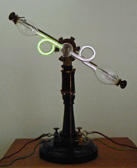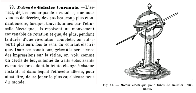 Les tubes de Geissler contiennent sous atmosphère raréfiée, ainsi que dans le verre de leur enveloppe, des traces de substances phosphorescentes ou fluorescentes. Lorsqu'ils sont traversés par le courant induit fourni par une bobine de Ruhmkorff, ils fournissent une lumière stratifiée intense dont les couleurs dépendent des éléments présents. Les effets sont plus spectaculaires lorsque le tube est animé d'un mouvement de rotation. Ce petit moteur, dont il existe différentes formes, est précisément destiné à recevoir l'un de ces tubes pour le faire tourner sur lui-même tout en assurant sa liaison avec la bobine de Ruhmkorff |