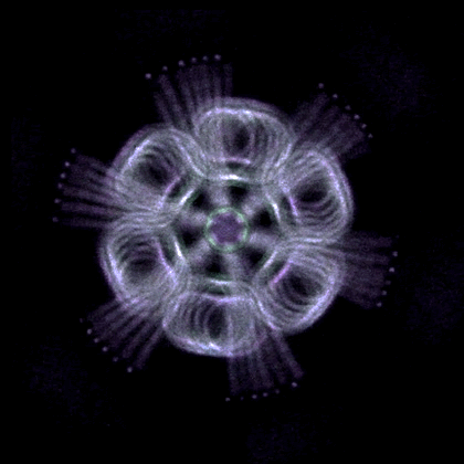 De part et d'autre de la photographie d'un tube immobile, les images obtenues lors de sa mise en rotation. |