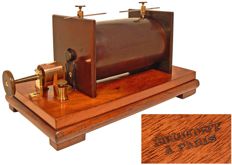 Le fonctionnement de la bobine à induction de Ruhmkorff est évoqué dans une page du Compendium : "Petites bobines de Ruhmkorff". Il s'agit, ici, d'un modèle plus important qui était utilisé pour les expériences classiques réalisées pendant les cours de physique. |