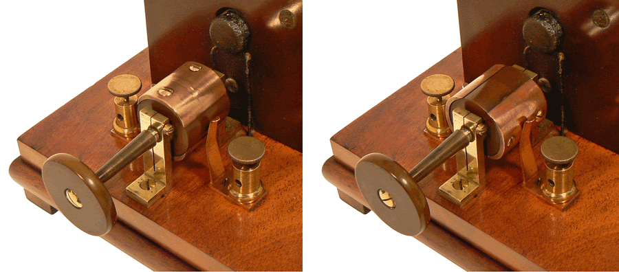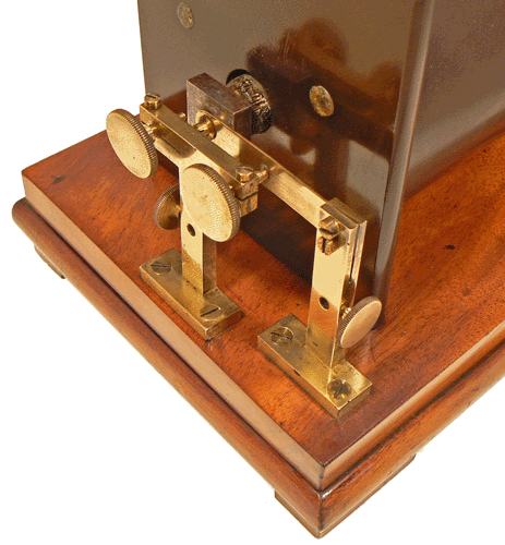 Les deux trous ménagés dans les montants de l'interrupteur à marteau servent à recueillir l'extra-courant produit à chaque interruption du courant inducteur. On peut, par exemple, les utiliser pour charger une bouteille ou une batterie de bouteilles de Leyde. |