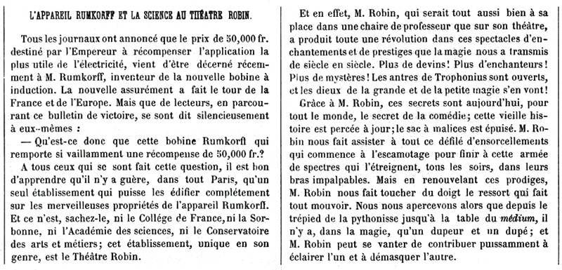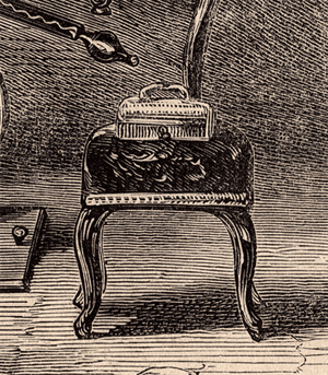 A côté, une cassette en fer, que nous imaginons remplie de pièces d'or, est posée sur un tabouret : un spectateur, invité par M. Robin, ne pourra pas l'emporter car elle est retenue par un puissant électro-aimant dissimulé sous le tissu du siège ... |