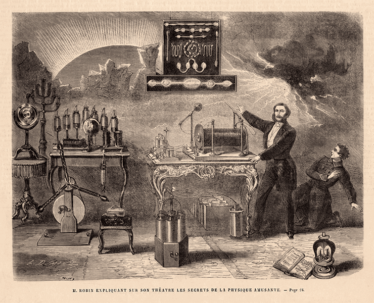 La grande bobine de Ruhmkorff occupe une place de choix sur la console en bois doré du Théâtre de M. Robin. Au-dessus est suspendu un présentoir pour les tubes de Geissler. Entre les pieds de la console sont disposées les piles qui alimentent l'appareil et le condensateur qui intensifie les effets. Devant, une batterie de bouteilles de Leyde sera éventuellement utilisée. Nous retrouvons bien tout ce qu'il est nécessaire de mettre en œuvre pour que jaillissent de belles étincelles entre les électrodes de la bobine d'induction. A droite et au premier plan, près du livre ouvert, il s'agit vraisemblablement d'un œuf électrique dans lequel on observe des lueurs dont l'intensité et la couleur dépendent des vapeurs présentes dans l'enveloppe en verre, de la pression qui y règne et de l'écartement des électrodes. On remarque, sur la gauche, posé au sol, un support à entraînement manuel recevant trois tubes de Geissler. |