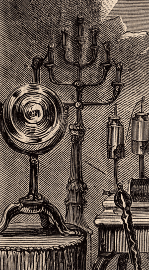 Entre un miroir ou une lentille sur pied et une série de condensateurs, les sept bougies du candélabre vont s'allumer par magie : un fil métallique très fin s'enroule en spirale autour de chaque mèche et retient en petite quantité des traces de "fulmi-coton", pour reprendre les termes de l'époque désignant la nitrocellulose très explosive. Le fil étant directement relié à une pile ou, peut-être, à la série de condensateurs chargés grâce à la bobine de Ruhmkorff, le passage du courant porte le métal à l'incandescence et enflamme la nitrocellulose : les bougies s'allument presque instantanément ... |