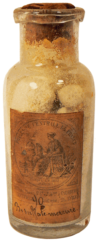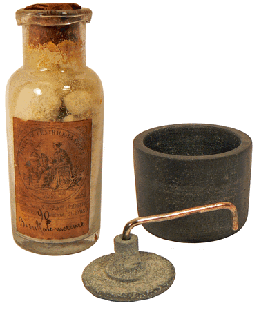 Dans le coffret, un ancien flacon d'électrolyte de la PHARMACIE CENTRALE DE FRANCE, le "bisulfate de mercure", utilisé pour la mise en oeuvre de la pile. |