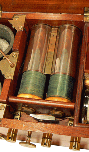 Dans la partie gauche du coffret se trouve l'alimentation constituée par une pile au sulfate de mercure (II) - on parlait autrefois de "bisulfate de mercure" - et, à la suite, le compartiment des bobines d'induction actuellement recouvertes du double cylindre graduateur. Plus à droite et au fond sont rangées les deux électrodes cylindriques porte-éponge et, au premier plan, le flacon d'électrolyte sous sa forme cristallisée. Dans la partie droite du coffret on distingue une électrode excitatrice courbe, terminée par une olive puis un emplacement vide qui devait contenir une électrode constituée par un pinceau de fils métalliques. |