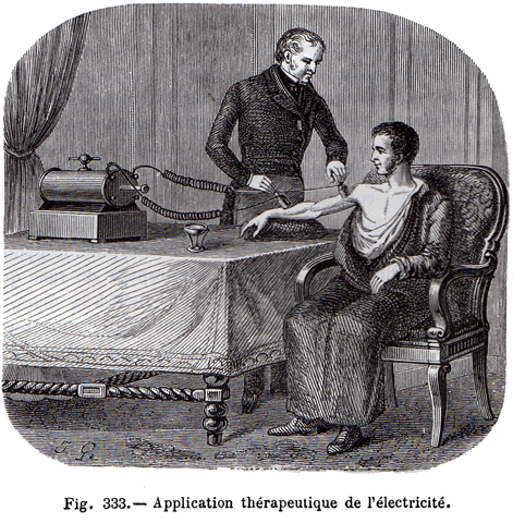Durant la deuxième moitié du 19e siècle, trois constructeurs, Gaiffe, Trouvé et Ruhmkorff, se sont distingués dans la fabrication des appareils d'induction de petite taille. Présentées en coffrets transportables renfermant les accessoires nécessaires à leur mise en œuvre, les bobines d'induction aux effets modérés étaient destinées à un usage médical. On pensait pouvoir soigner bon nombre de maux, en particulier les affections nerveuses et les paralysies locales, en faisant appel aux "propriétés bienfaisantes" de l'électricité. Les coffrets ou les trousses d'électricité médicale variaient par leurs dimensions, la nature des piles utilisées et le dispositif de réglage. |