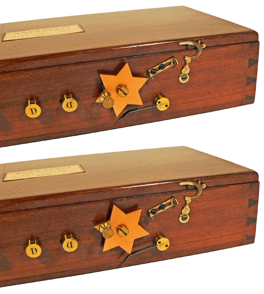 Dans la traduction française de 1884 du TRAITÉ ÉLÉMENTAIRE DE PHYSIQUE MÉDICALE du Dr W.Wundt, il est reproché à l'appareil portatif de Ruhmkorff le fait que les bornes de branchement des électrodes, la vis de réglage de la rapidité des oscillations du trembleur et l'interrupteur à dents, sont très saillants à l'extérieur et donc vulnérables. La remarque est fondée et c'est, sans doute, ce qui a conduit un ancien utilisateur à faire fabriquer un deuxième coffret de protection particulièrement efficace ... |