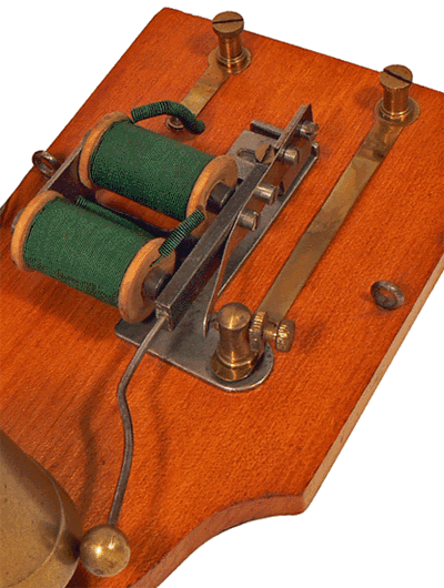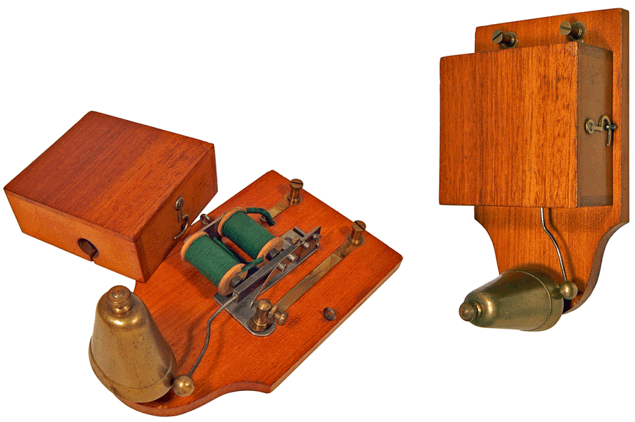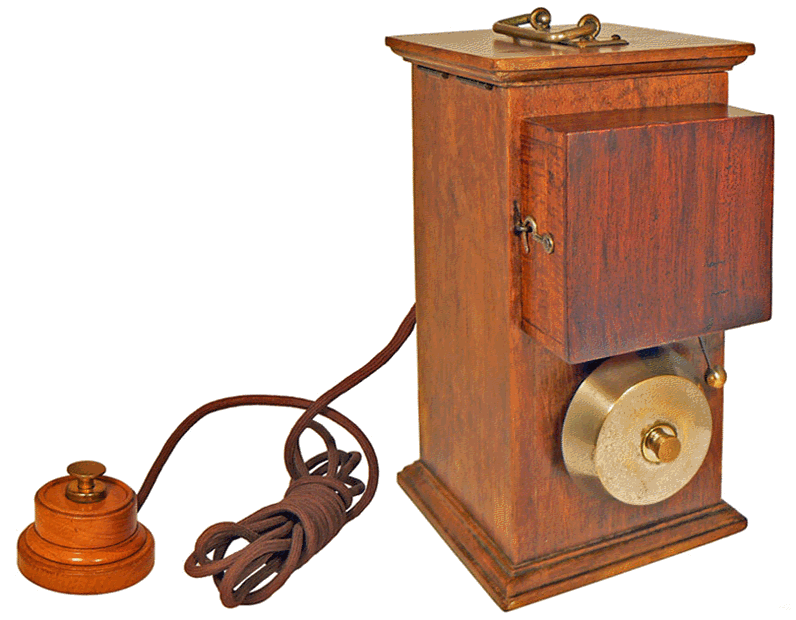 Ce modèle, fait pour être déplacé, possède le même mécanisme que précédemment fixé sur l'une des faces d'un coffret renfermant la pile qui l'alimente. A l'origine, l'extrémité du cordon de connexion n'aboutissait pas directement à la "pédale de parquet" comme c'est ici le cas, mais à une fiche à deux broches adaptable à une base de prise spécifique, fixe. Dans une vaste demeure, de telles bases de prises pouvaient être réparties dans les différentes pièces et reliées au bouton d'appel placé dans le bureau ou le salon du maître de maison. Lorsque ce dernier avait besoin d'appeler un employé de maison - un employé qui, bien sûr, branchait toujours son coffret là où il se tenait - il lui suffisait de le "sonner" en pressant le bouton d'appel ... |