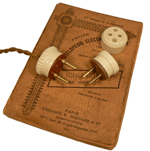 Sur la gauche et en reprenant les termes des catalogues de matériel électrique du début du 20e siècle, est photographié un "bouchon en porcelaine à écartement normal" destiné à l'alimentation des appareils domestiques en courant électrique de tension égale à 110 V. A droite, il s'agit d'un bouchon et sa base de prise murale, utilisés dans un réseau d'appel : l'écartement des broches est plus faible ce qui évite toute confusion... |