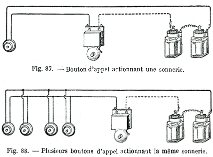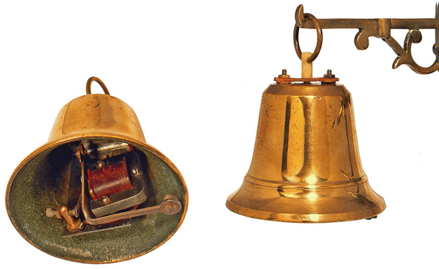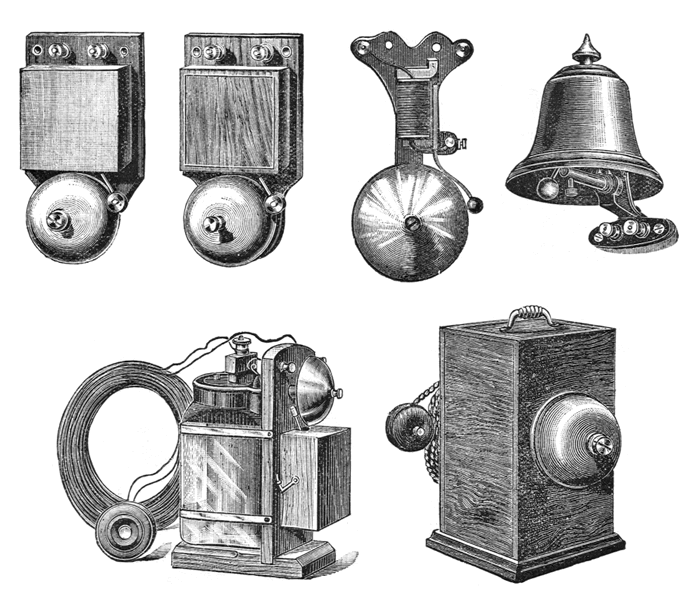 Comme le montre le schéma emprunté au Traité d'ÉLECTRICITÉ d'Alfred Soulier, la sonnerie se compose d'une planchette sur laquelle est fixé un électroaimant A, dans lequel arrive, par une borne M, le courant de ligne, ou le courant d'une pile locale. De l'électroaimant, le courant gagne une lame élastique en acier C, qui porte l'armature B et vient toucher la pointe d'une vis placée latéralement et qui communique avec le fil ou la barrette de retour vers la borne N. |