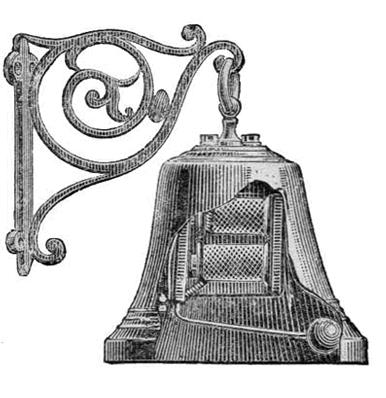 C'est entre la lame élastique C et la pointe de la vis que se produit l'interruption chaque fois que l'armature s'approche de l'électroaimant. Ce dernier devient alors inactif ; mais la lame C ramène aussitôt, en vertu de son élasticité, l'armature en contact avec la pointe de la vis, le courant passe de nouveau, et ainsi de suite, avec une grande rapidité, tant que le courant arrive à la sonnerie. Chaque fois que le courant passe dans l'électroaimant, l'armature est attirée et entraine avec elle un marteau P, qui frappe un timbre T et le fait résonner... |
