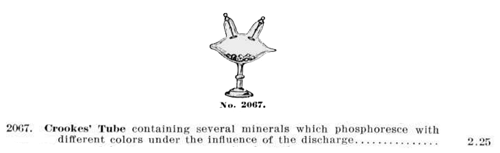 L'ampoule de forme ovoïdale contient des fragments de substances fluorescentes, par exemple les sels de baryum, de calcium, de zinc, de cadmium et de strontium, ou encore le rubis ou le diamant. Deux électrodes plates reliées à la bobine de Ruhmkorff permettent de provoquer une décharge électrique dans un vide beaucoup plus poussé que celui des tubes de Geissler. |