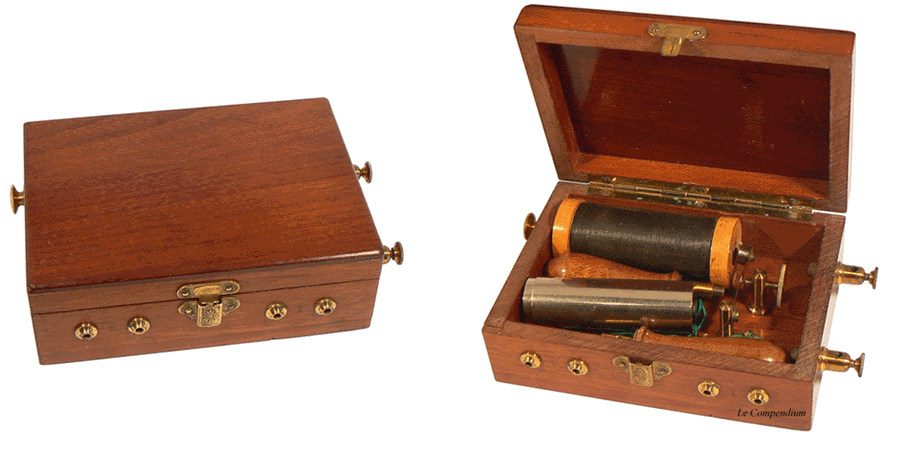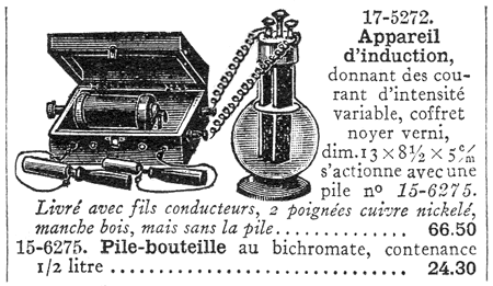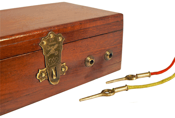 A la fin du 19ème siècle et jusque dans les années 1920, des appareils d'induction sont proposés, à des fins quelquefois "médicales" mais surtout ludiques, dans des petits coffrets en noyer ou en acajou. On y trouve uniquement les cordons de connexion et les électrodes métalliques, cylindriques et creuses ou "manipules", que l'on fait tenir à pleines mains par un sujet qui, au passage du courant, reçoit des secousses peu agréables ... Ces appareils, souvent sans marque apparente, nécessitent l'utilisation d'une pile externe telle une pile Grenet. |