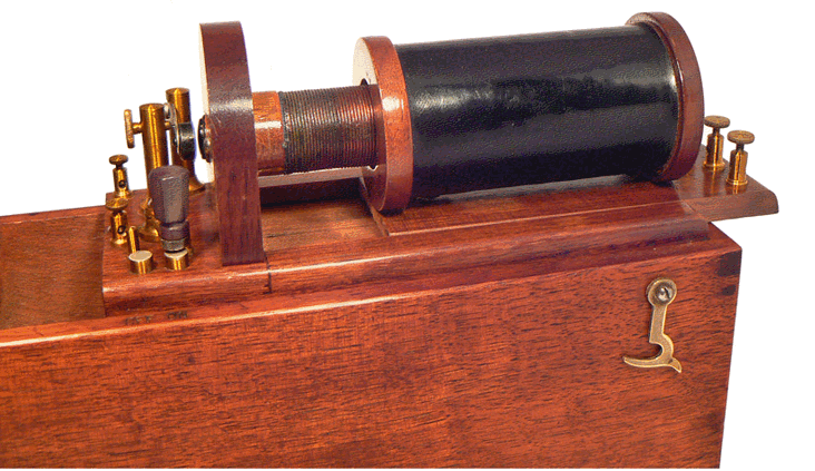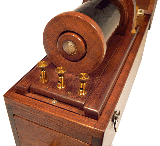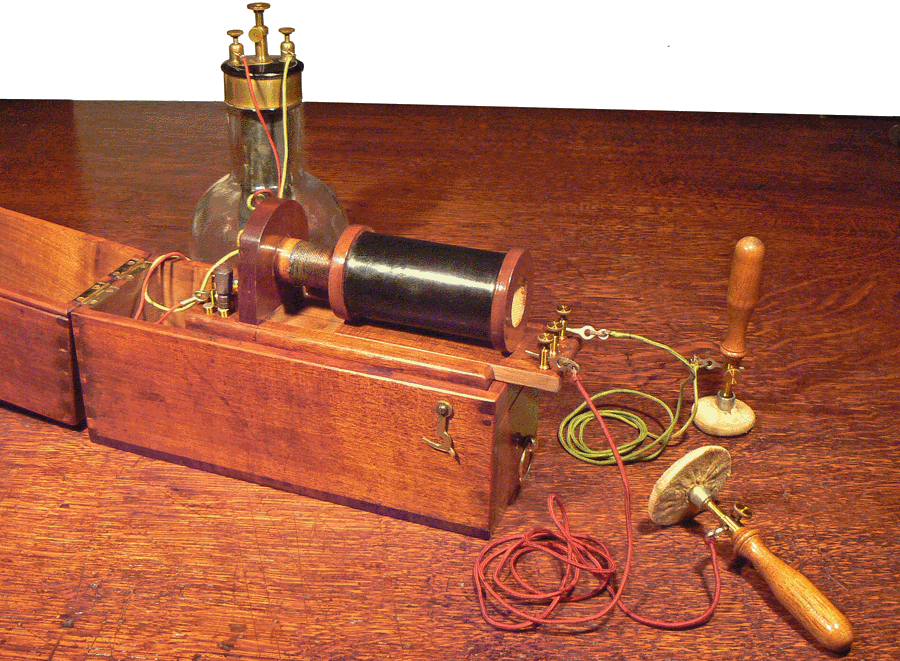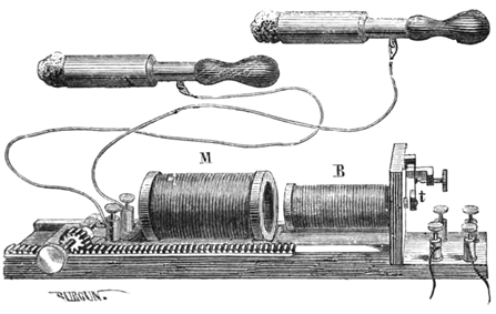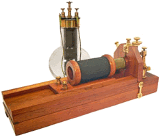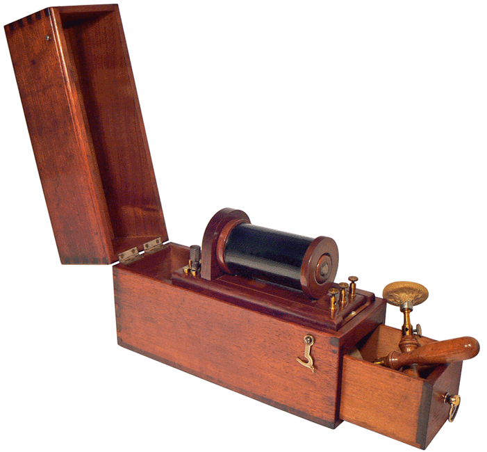 On reconnait facilement des organes similaires à ceux de la bobine de Ruhmkorff dont le principe est développé sur une autre page du Compendium. Toutefois, un élément important distingue l'appareil de Du Bois-Reymond, médecin et physiologiste allemand : la bobine induite peut se déplacer suivant son axe. Dans le TRAITÉ D'ÉLECTRICITÉ MÉDICALE, E. Onimus et Ch. Legros décrivent les appareils "électro-magnétiques" à usage médical. A l'époque - nous sommes en 1872 - les coffrets pour électrothérapie de Ruhmkorff et de Gaiffe sont les plus employés. Ils sont jugés "très commodes et capables de donner, sous un petit volume, des courants d'induction très énergiques". L'appareil de Du Bois-Reymond est, lui, remarqué par la possibilité qu'il offre de faire varier la distance entre bobine d'induction et bobine induite mobile. Par suite il est plus facile de graduer la force électromotrice induite. |