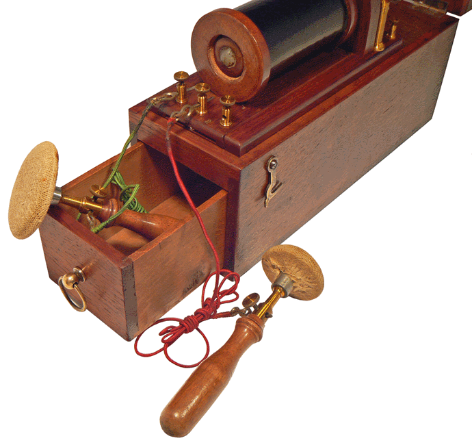 La bobine inductrice, de plus faible diamètre, est alimentée par la pile Grenet. Le courant électrique délivré par la bobine induite est, comme pour les autres appareils d'électrothérapie, transmis au patient par contact et en utilisant la même gamme d'électrodes excitatrices. Ici, les excitateurs sont en forme de larges boutons plats recouverts de coton. Pour assurer un bon contact électrique avec les tissus humains, ce coton doit être humidifié avec de l'eau salée ... |