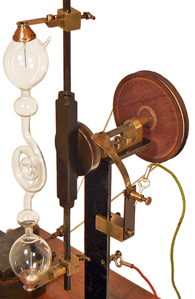 La potence métallique noire portant l'axe de rotation du tourne-tube et la lame en cuivre frottant sur le collecteur circulaire sont isolées l'une de l'autre par une plaquette en bakélite. On comprend que les deux fiches, actuellement branchées et qui terminent les cordons de connexion vert et rouge, sont reliées aux extrémités du tube de Geissler. |