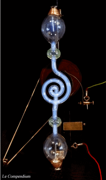 Les vignettes qui suivent mènent aux pages du Compendium relatives, les deux premières à différentes bobines de Ruhmkorff, la troisième au petit moteur tourne-tube de Geissler. La grande image conduit aux tubes de Geissler. Il suffit de cliquer sur une des représentations pour entrer directement sur la page qui lui correspond. |