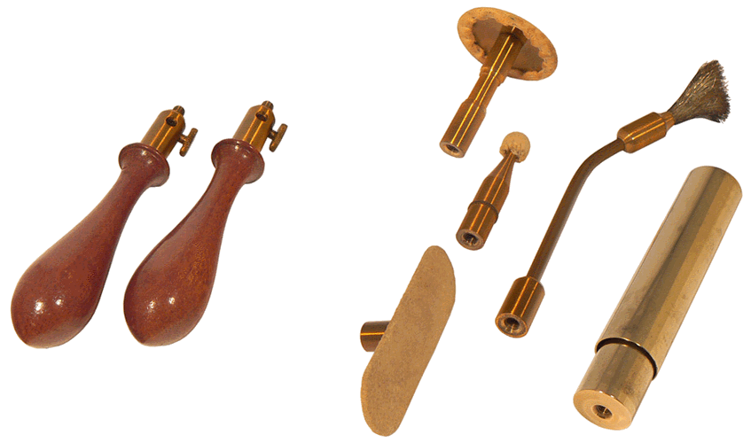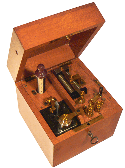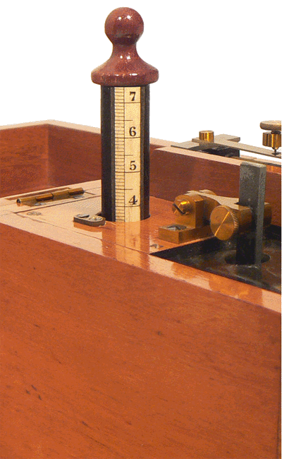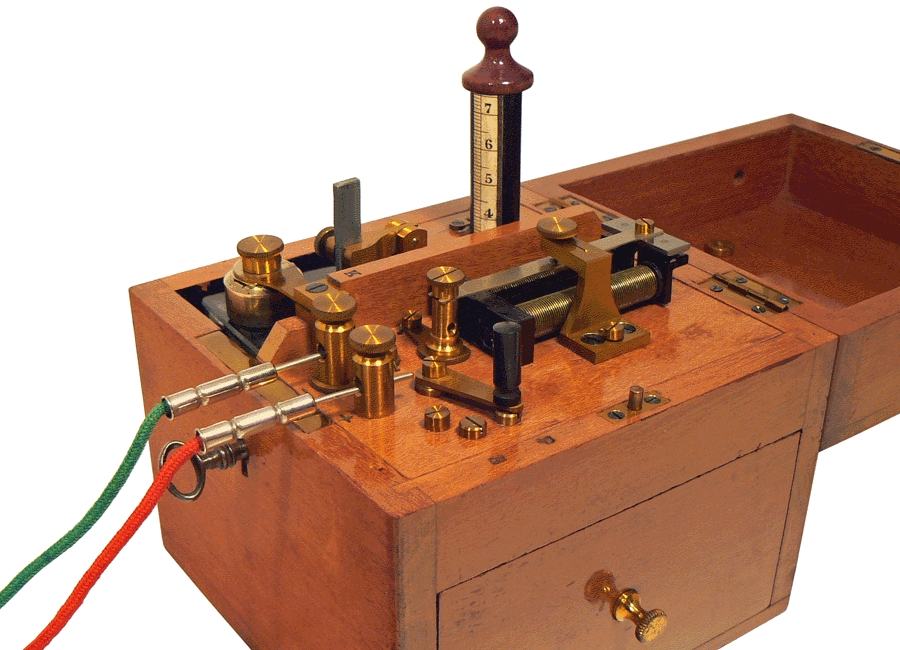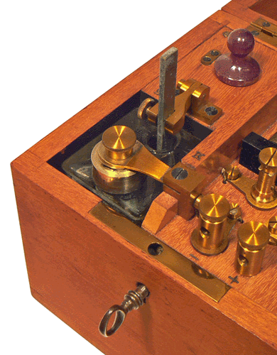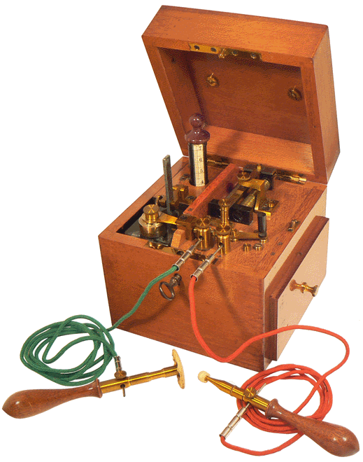 Près des deux manches isolants, les différentes électrodes présentes dans le coffret. Les trois premières sont revêtues de peau de chamois destinée à être humidifiée pour parfaire le contact avec les différents muscles du corps humain. La quatrième, plus longue, est terminée par un petit balai de fils métalliques : on l'utilise en parcourant et frappant légèrement la surface malade, ou en la laissant en place aussi longtemps que le patient peut le supporter... Les deux dernières électrodes, à droite, imbriquées l'une dans l'autre pour le rangement, sont utilisables à sec ou comme cylindres porte-éponge. En 1861, dans son ouvrage "de L'ÉLECTRISATION LOCALISÉE", Guillaume DUCHENNE (Duchenne de Boulogne), médecin neurologue, décrit les pratiques et le mode d'utilisation des différentes électrodes ou "réophores". Notons que l'on trouve, dans la littérature scientifique et technique de cette époque, les deux orthographes, "réophores" et "rhéophores" pour désigner, quelquefois les électrodes, quelquefois les connexions filaires, quelquefois les uns puis les autres... |