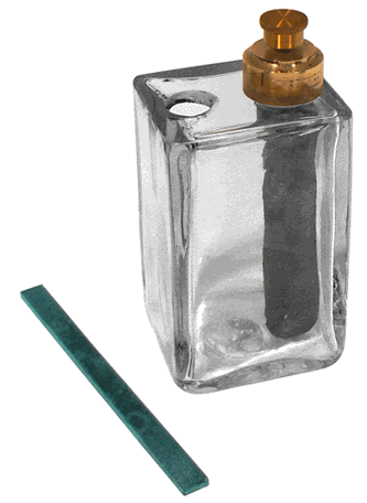 Sur la photographie à gauche, le petit récipient en verre limitant l'espace propre à la pile est retiré de son logement. L'électrode cylindrique en carbone est en place et l'électrode plate en zinc est, pour l'instant, posée près du récipient. L'électrolyte utilisé est une solution aqueuse de dichromate de potassium et d'acide sulfurique. Une petite quantité de sulfate de mercure est ajoutée afin, par formation d'un amalgame, de préserver l'état de surface du zinc. Sur la photographie de droite, l'élément est placé dans son compartiment et ses deux électrodes sont reliées électriquement au circuit interne du coffret. |
