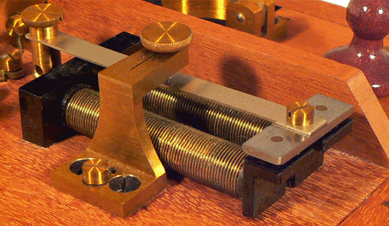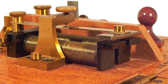 Un électro-aimant à armature en U joue le rôle d'interrupteur. Sur la photographie, on distingue, à droite et en noir, ses pièces polaires et, juste au dessus, la plaquette en fer doux fixée à l'extrémité d'une longue lame métallique fine et souple, susceptible de vibrer verticalement. Actuellement, la zone centrale de la lame est en contact avec la pointe de la vis ce qui assure le passage du courant généré par la pile dans l'enroulement primaire de la bobine. Le courant passe dans l'électro-aimant ce qui provoque l'attraction de la plaquette en fer doux par les pièces polaires. |