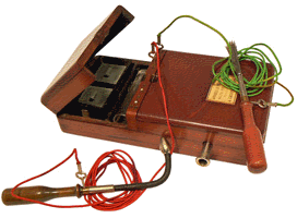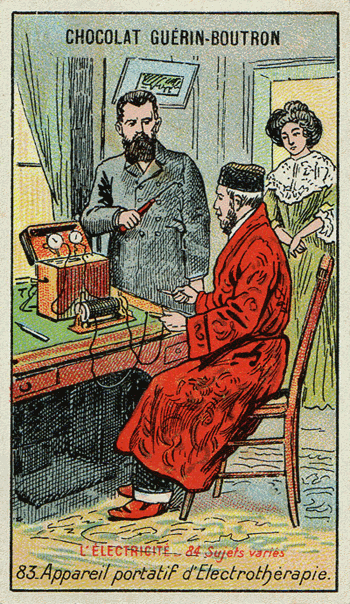 Nous sommes alors à l'époque où l'on pense pouvoir tout soigner par l'électricité. Dans la première partie du XXe siècle, il n'est pas rare de lire des slogans publicitaires tels que "FORCE, SANTÉ, ET VIGUEUR PAR L'ÉLECTRICITÉ", invitant à l'acquisition d'ouvrages qui ne relèvent pas toujours de la médecine pure et qui prônent le recours systématique à l'électrisation. Dans le domaine de l'utilisation de l'électricité en médecine, des travaux très sérieux ont été réalisés et des résultats probants obtenus mais, en même temps, les charlatans se sont emparés de l'idée que l'électricité guérissait tout, et même plus ... |
