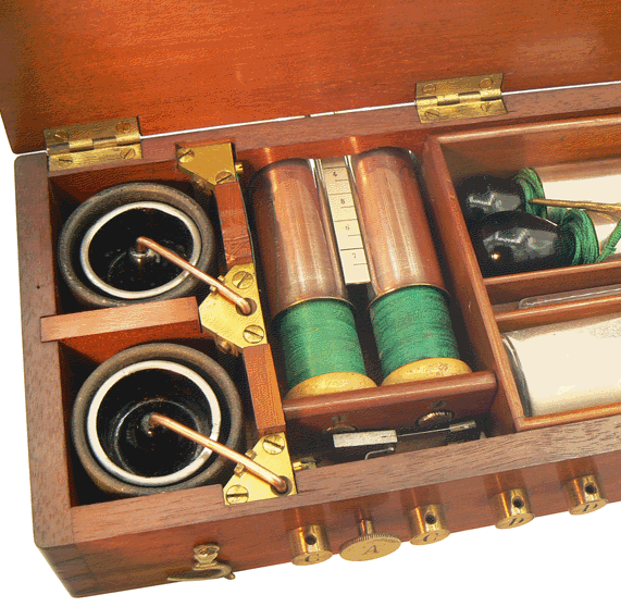 Les enroulements primaires des bobines sont alimentés par deux piles du type Marié-Davy. Chacune est constituée d'un godet en charbon de cornue d'un peu plus de 4 cm de diamètre, pôle positif, recevant une solution de sulfate de mercure (II) dans laquelle plonge un cylindre en zinc, pôle négatif. On remarque, dans le compartiment actuellement vide du coffret, la lame ressort métallique réalisant le contact avec le godet positif... A gauche sur la photographie, le flacon à col rodé contenant l'électrolyte cristallisé ainsi que la petite cuillère en verre, ont leur place dans le coffret. |