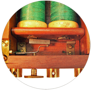 Pour régler la force du courant induit, deux cylindres en cuivre argenté forment un double manchon mobile recouvrant les bobines. Ces cylindres deviennent le siège de courants induits en minimisant ceux que recueillent le patient On peut, à l'aide du bouton B, les déplacer de manière à ce qu'ils recouvrent plus ou moins les enroulements secondaires. Plus grande est la partie des bobines recouverte par le double manchon et plus faibles sont les courants. Si le double manchon est retiré, les secousses sont plus énergiques... |