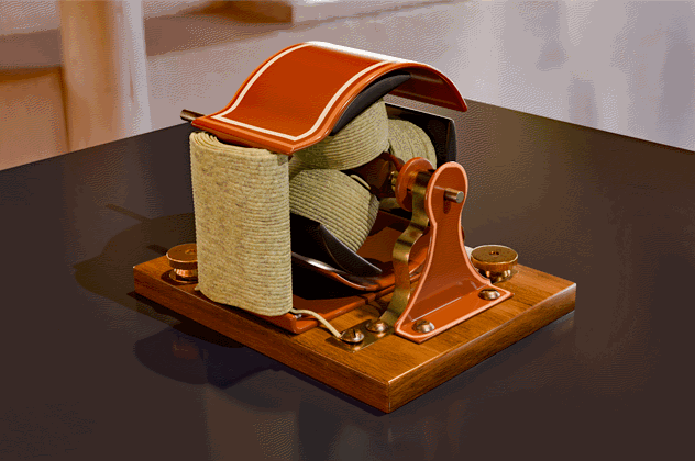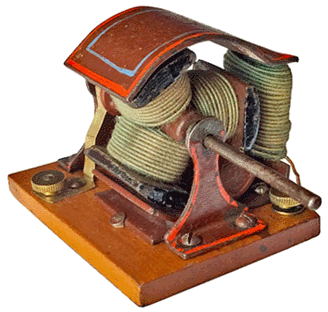 Le rotor, au centre, est formé par trois bobines à l'extrémité épanouie disposées en étoile et dont les enroulements, reliés au collecteur rotatif à trois secteurs, sont alimentés par les balais comme on le voit sur l'image de gauche. Le stator, à droite, est constitué par un enroulement réalisé autour d'une cage constituée de fines plaques de fer doux. |