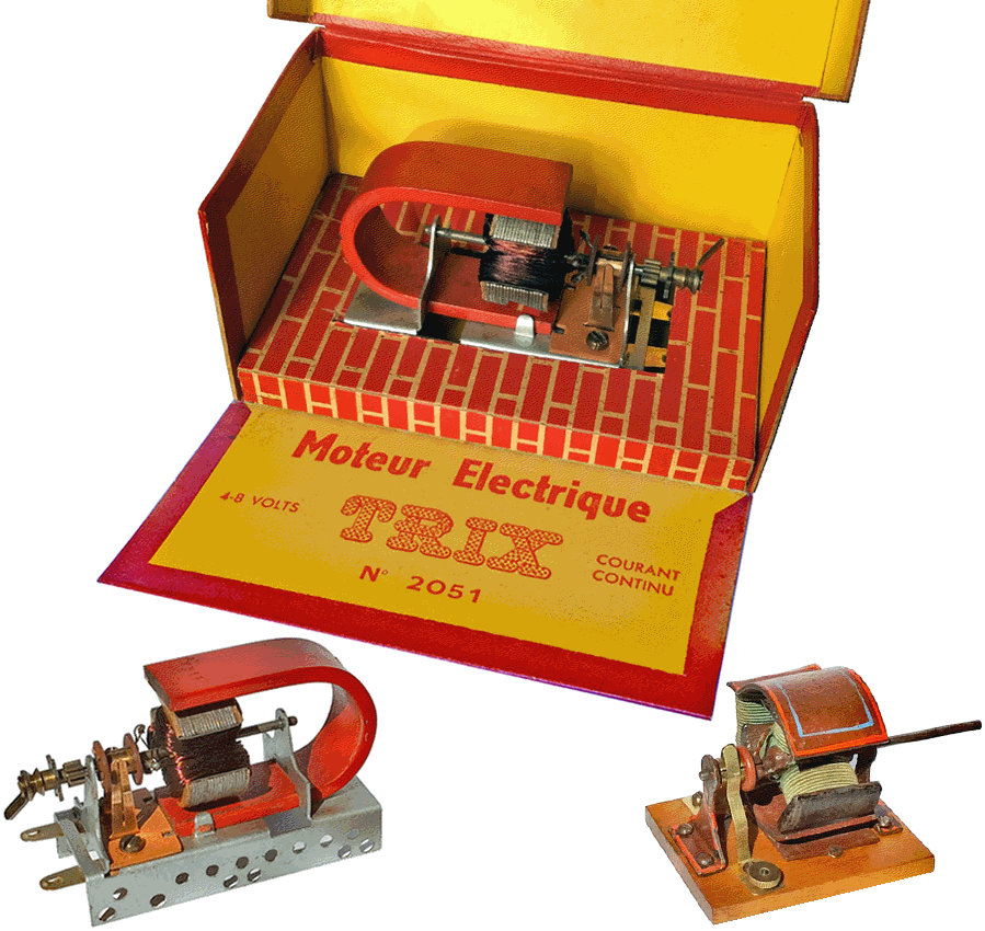Un de ces moteurs est photographié près de notre spécimen. On peut observer des similitudes quant aux dimensions et à la réalisation de certains éléments comme le rotor de 3 cm de diamètre et son collecteur rotatif. Bien sûr, le socle aux nombreux trous répond aux caractéristiques spécifiques du matériel TRIX. La différence réside dans le stator qui, sur ce dernier, est un aimant permanent. Le modèle de droite, sur socle en noyer, nous semble le plus ancien. La finition aux filets colorés pourrait en faire une productions MÄRKLIN des premières années 1900 ... |