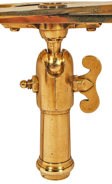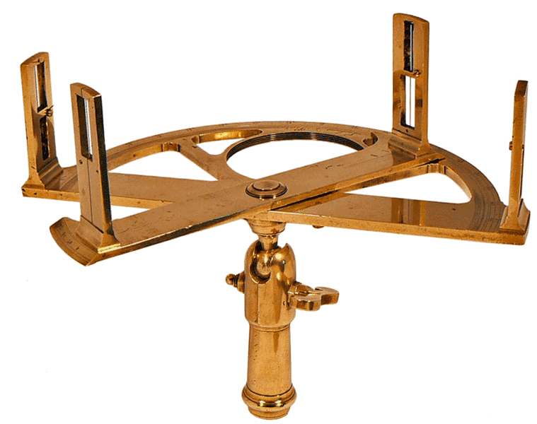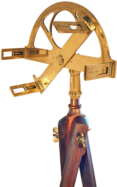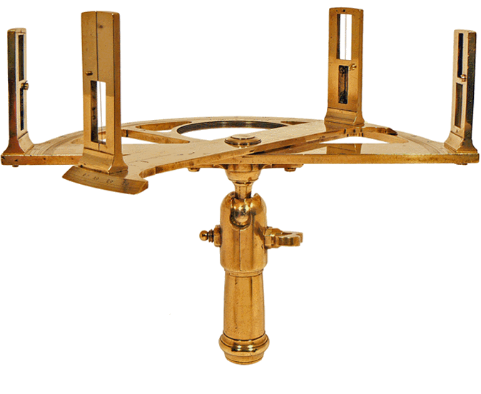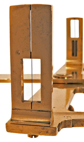 A droite, l'une des alidades. L'oeil doit aligner la fente de la pinnule du premier plan, le crin qui partage la fenêtre de la pinnule la plus éloignée et, au delà, l'objet ou le jalon considéré. |