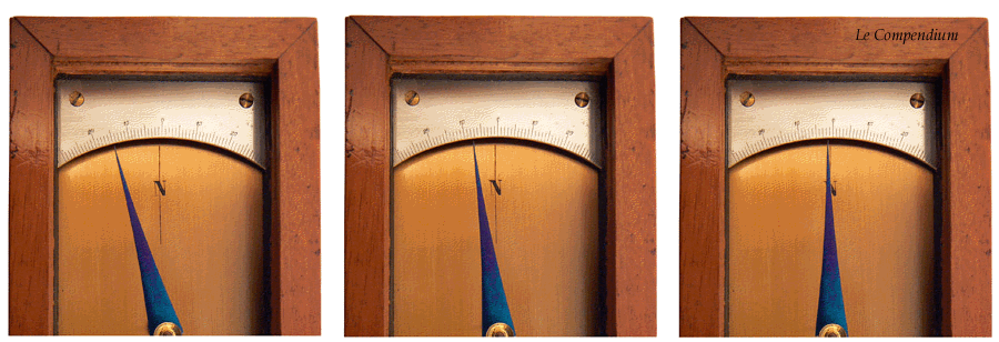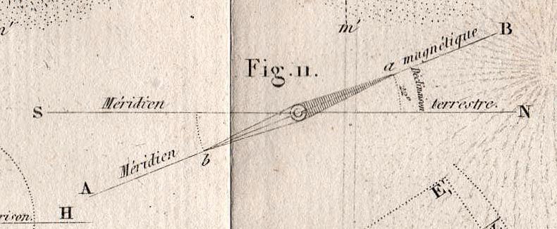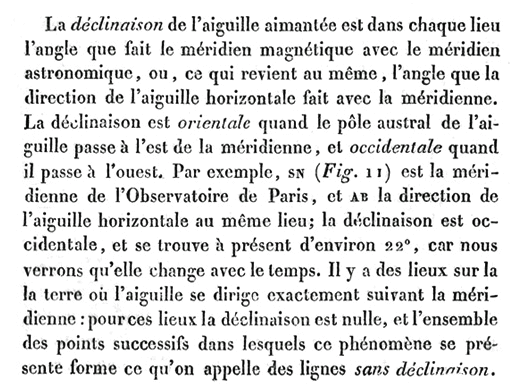 Le texte et le dessin qui précèdent appartiennent à l'ouvrage de M. POUILLET, "ÉLÉMENS DE PHYSIQUE ÉXPÉRIMENTALE ET DE MÉTÉOROLOGIE", dans sa seconde édition de 1832. La valeur de la déclinaison magnétique indiquée pour PARIS, et voisine de 22° occidentale, est celle d'alors. Les trois images qui suivent illustrent la variation de la déclinaison parisienne depuis 1900. |