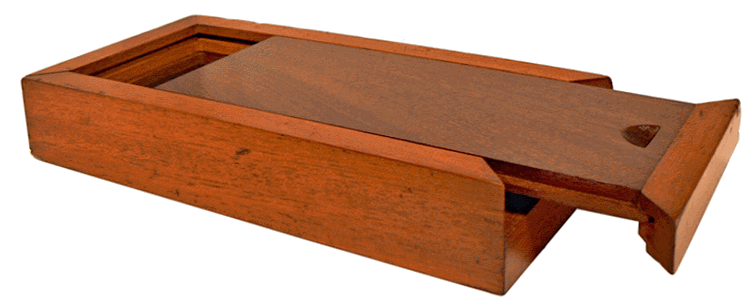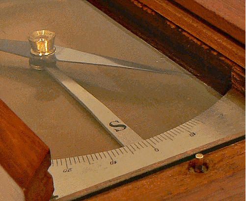 Le couvercle à glissière, placé ici à l'envers, est muni d'une languette métallique. Lors de la fermeture du coffret, cette languette appuie sur un petit bouton en laiton qui actionne le levier portant le repère "S". L'aiguille aimantée se trouve alors soulevée jusqu'à venir en butée avec la glace de protection. La boussole est en position de repos permettant son transport. |