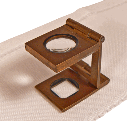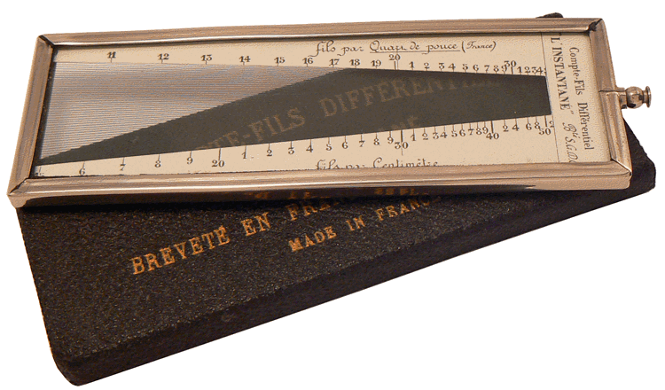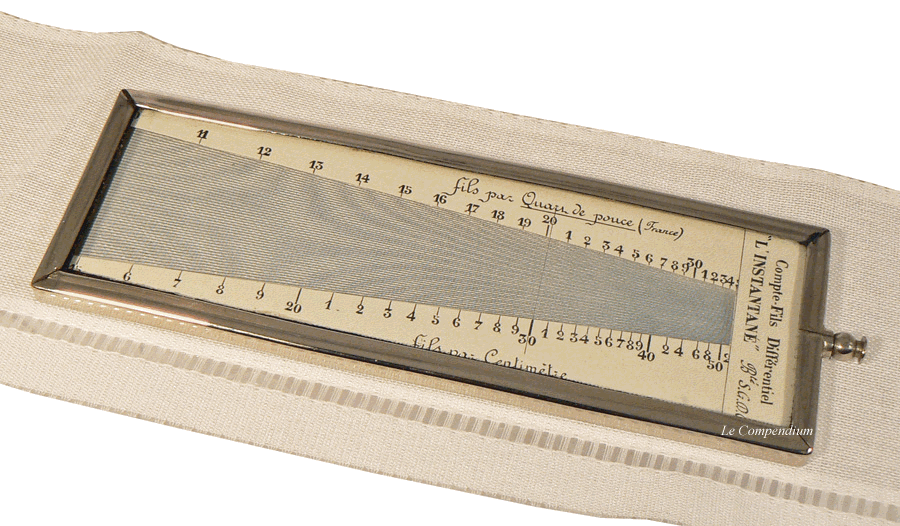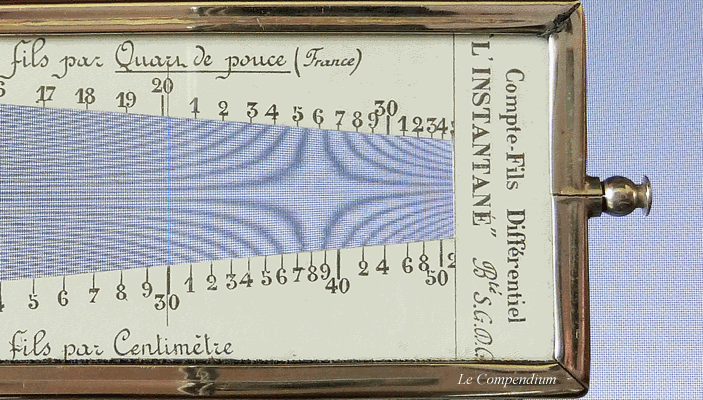 Sur la photographie précédente, le compte-fils est posé sur un voilage en lin. La zone de coïncidence des deux réseaux, celui du compte-fils et le réseau à mesurer représenté par le voilage, se situe entre 18 et 19 (la graduation inférieure, à gauche, part de 15), correspondant au nombre de fils par centimètre ou, ce qui revient au même, entre 12 et 13 fils par quart de pouce. La lecture est bien immédiate comme l'indique le nom, "L'INSTANTANÉ", de l'instrument ... |