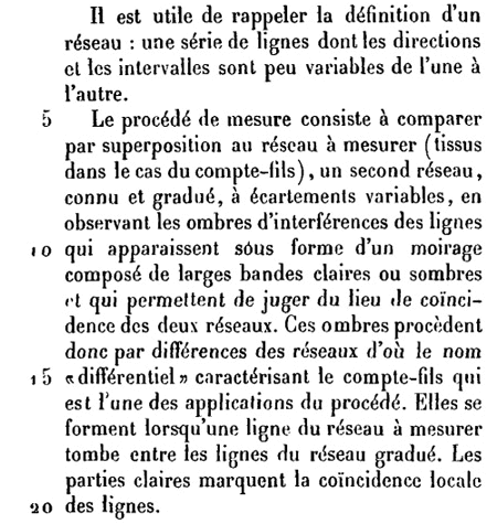 L'instrument est constitué de deux plaques en verre entre lesquelles est inséré un réseau d'une cinquantaine de traits s'écartant progressivement les uns des autres. Le réseau, obtenu par un procédé photographique ou par gravure, est accompagné d'une graduation indiquant le nombre de passages de traits par centimètre (ou par quart de pouce de France). Ce nombre varie de 15 traits d'un côté à 52 traits de l'autre. Il suffit de placer le compte-fils de manière à ce que son axe de symétrie soit parallèle à la trame d'un tissu et de repérer la zone de coïncidence entre les traits du réseau et les fils du tissu. Cette zone apparait en clair et sépare deux ensembles ombrés et courbés situés de part et d'autre. |