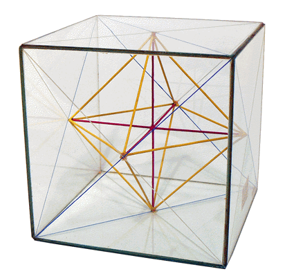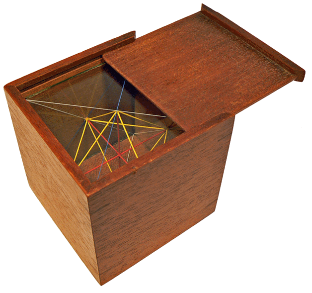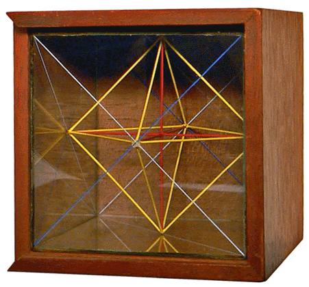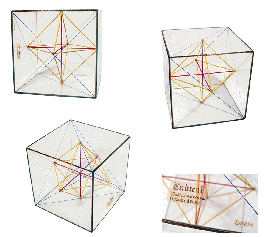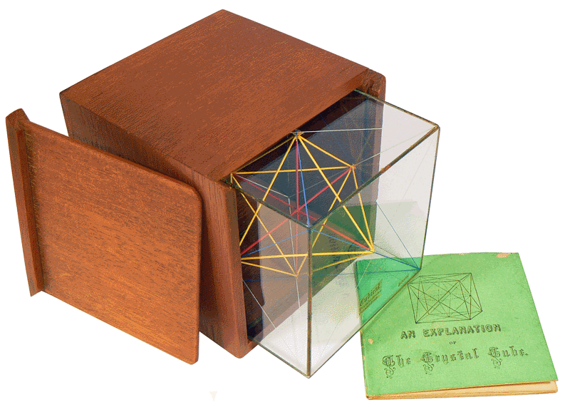 Le cube de 7,7 cm (3 pouces anglais) de côté proposé par J.R. LARKIN en 1863 est, ici, en partie sorti de son coffret. Les faces sont en verre dont l'épaisseur ne dépasse pas le millimètre ... Les diagonales gravées sur l'intérieur de chaque face ainsi qu'un réseau de fines baguettes colorées qui en relient les centres, permettent de matérialiser les angles, figures planes et volumes remarquables. |