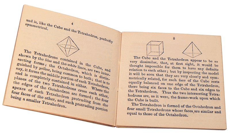 Le petit livret de 22 pages, "An Explanation of the Crystal Cube", décrit les différents éléments du cube et aide à mettre en évidence les lignes, les surfaces géométriques et les volumes fondamentaux, leurs combinaisons ainsi que les liens qui existent entre eux. En fonction de l'angle sous lequel on observe le modèle, on repère les axes cristallographiques, les triangles et les polyèdres imbriqués ou inscrits les uns dans les autres. Le modèle était utilisé en minéralogie et géologie comme l'indique le Catalogue of the science collection for teaching and research in the South Kensington Museum (London -1892) dans lequel il est décrit sous différentes formes, toutes proposées par J.R. Larkin entre 1857 et 1866. |