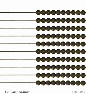 Ces bouliers consistent en un cadre portant dix tringles métalliques sur chacune desquelles sont enfilées dix boules pouvant être déplacées par glissement. L'instrument est doté de dix dizaines, soit cent boules. |
