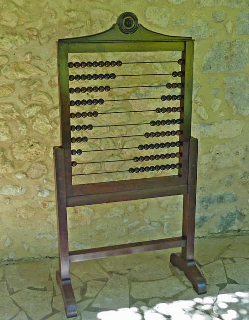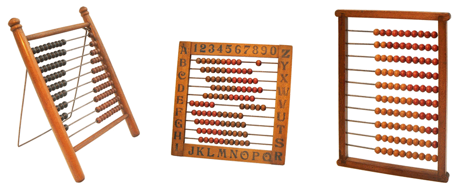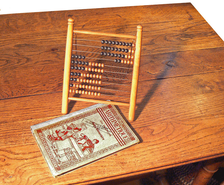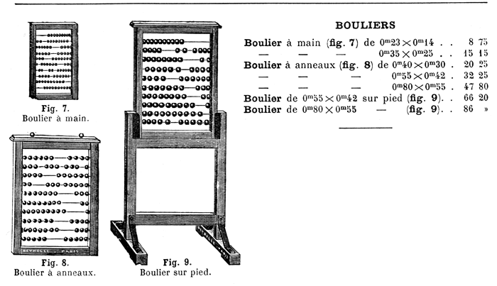 A l'école élémentaire, le boulier était utilisé pour enseigner les premiers éléments de l'arithmétique, c'est-à-dire les notions d'unité, de dizaine et de centaine et les opérations fondamentales comme l'addition et la soustraction. Le maître avait à sa disposition un boulier de grande taille, quelquefois sur pied et sur lequel il déplaçait les boules à l'aide d'une baguette. Les élèves, eux, possédaient un petit boulier à main qu'ils pouvaient ranger dans leur cartable. |