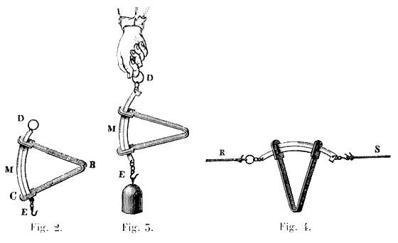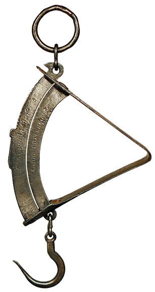 L'instrument est formé d'une lame d'acier recourbée en son milieu et portant à ses extrémités deux arcs en fer. Le premier est soudé, par son extrémité inférieure à l'une des branches de la lame d'acier tandis que son extrémité supérieure traverse librement l'autre branche pour se terminer par un anneau destiné à suspendre l'instrument. Le second arc est soudé par sa partie supérieure à la deuxième branche de la lame d'acier tandis que sa partie inférieure traverse librement la première branche et se termine par un crochet auquel on suspend l'objet à peser. Le poids de l'objet fait fléchir la lame d'acier en rapprochant ses deux extrémités. Ce rapprochement est mesuré par l'arc extérieur qui porte une graduation indiquant le poids du corps suspendu... |