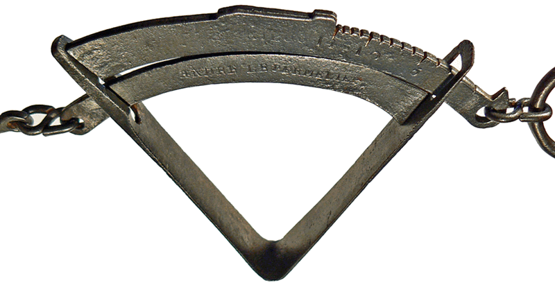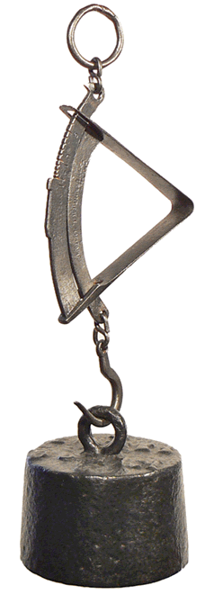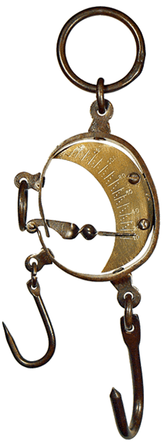 L'instrument agit par déformation d'une lame d'acier courbe et ouverte. Le modèle présenté offre deux sensibilités selon que l'on utilise le petit anneau avec le petit crochet de suspension (photographie de droite) ou l'anneau et le crochet les plus grands (photographie de gauche). |
