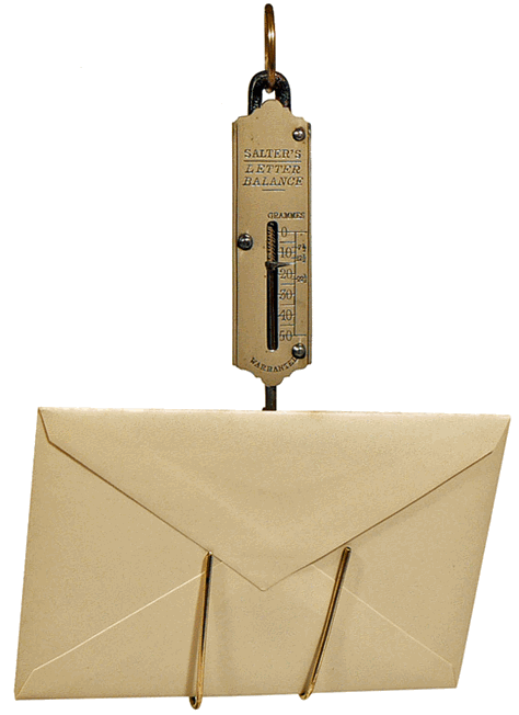 Pèse-lettres SALTER, gradué en gramme jusqu'à 50 g. Dimensions du cadran : 7 x 2 cm - Longueur totale : 17 cm |